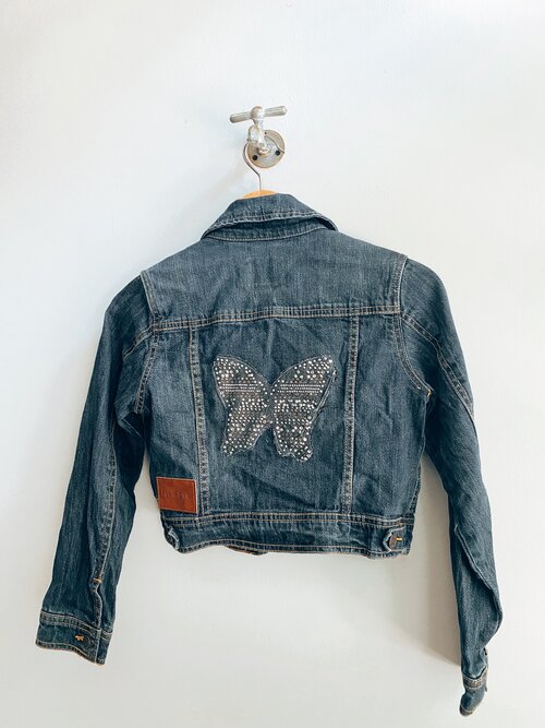 Upcycled KIDS Denim Jacket / Rhinestone Butterfly Patch