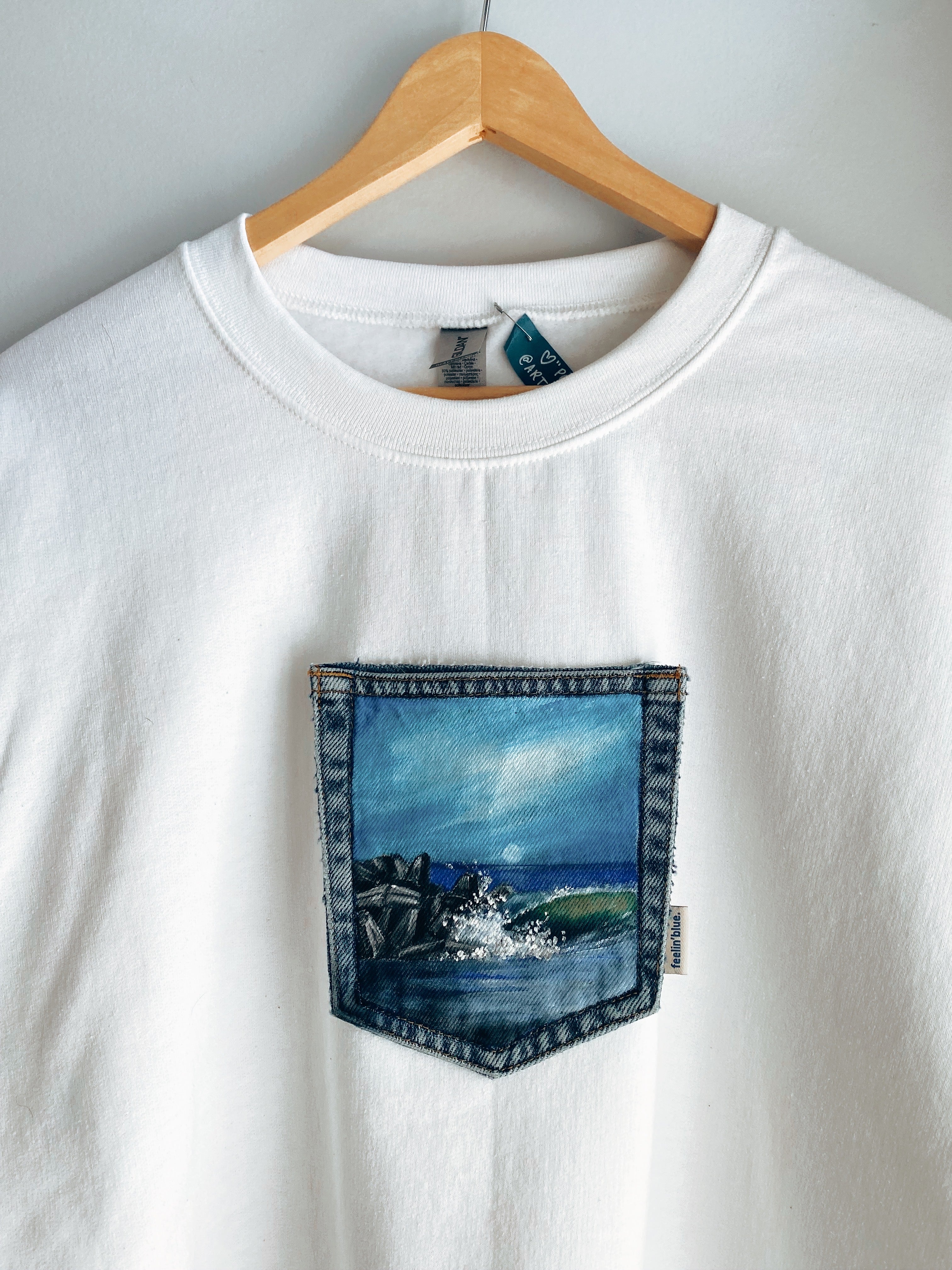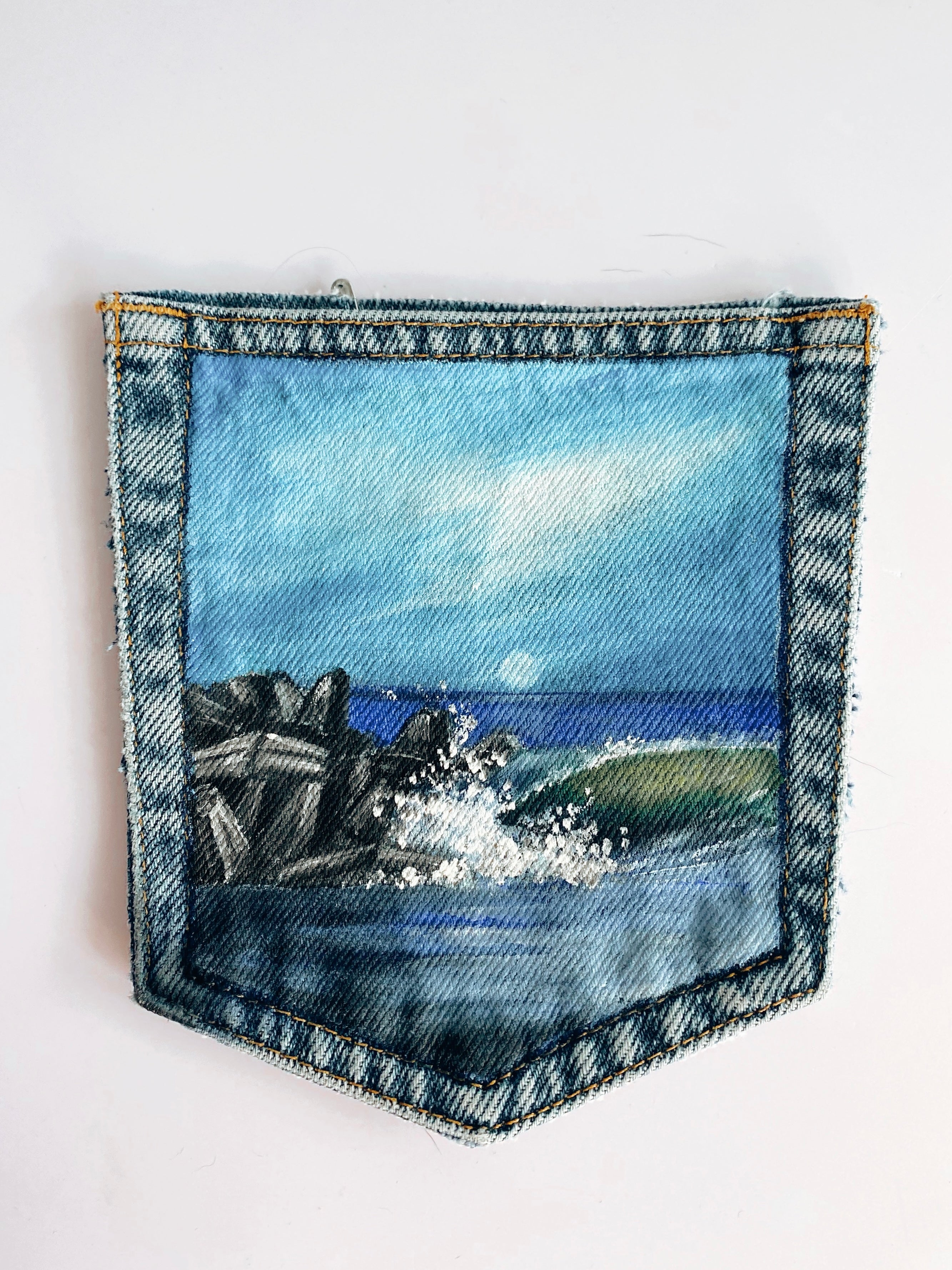 All of our denim pieces are sourced with intention and care. We collect donated jeans and other denim items from local community members, thrift stores, estate sales, and vintage suppliers—many of them right here in New Jersey. From there, it’s cleaned, deconstructed, and transformed into one-of-a-kind Feelin’ Blue pieces.